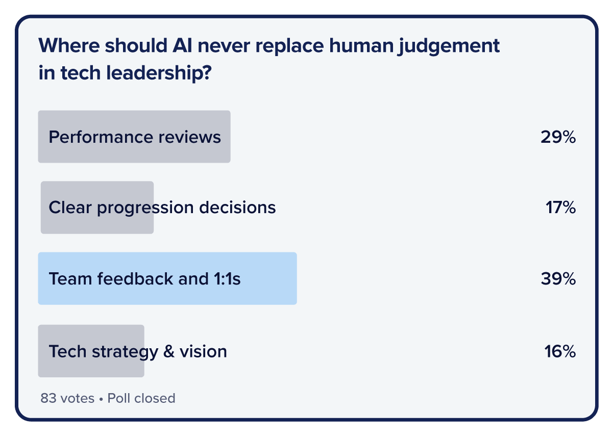Before this session we asked the dev community where AI should stay out of leadership decisions. The verdict? Team feedback and 1:1s topped the list (39%), followed by performance reviews (29%).